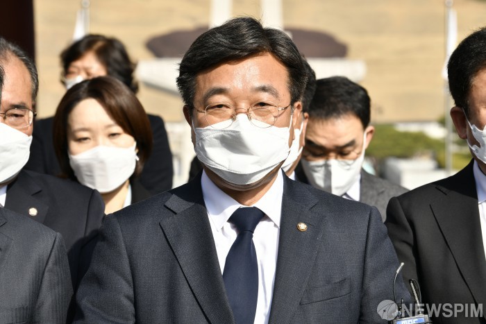 윤호중 행정안전부 장관이 더불어민주당 비대위원장을 맡았던 2022년 광주 북구 운정동 국립 5·18민주묘지를 참배하고 취재진 질문에 답하고 있다. [사진=뉴스핌DB]