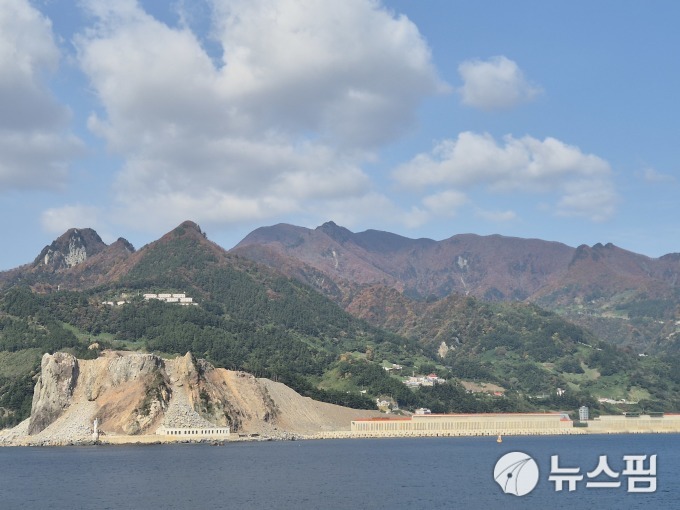 | 울릉도에서 포항으로 출항하는 크루즈에서 보이는 울릉공항 공사 현장의 모습. 가두봉이 상당 부분 깎여나간 상태다. [사진=정영희 기자] |