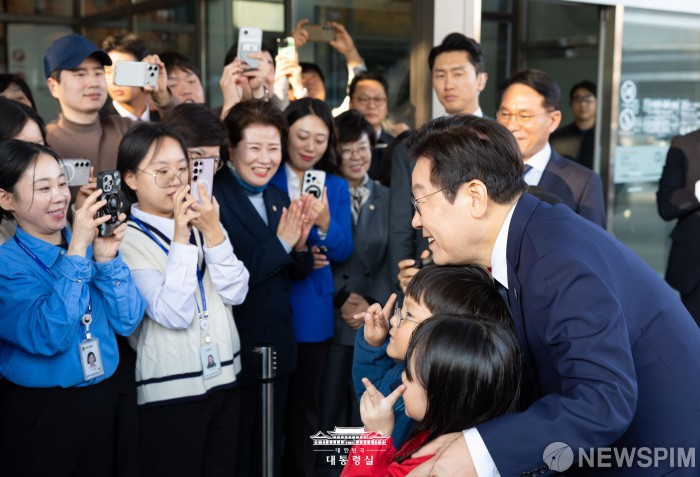 [서울=뉴스핌] 이재명 대통령이 7일 대전 유성구 국립중앙과학관에서 열린 다시 과학기술인을 꿈꾸는 대한민국 국민보고회에 향하며 아이들과 기념촬영을 하고 있다. [사진=대통령실] 2025.11.07 photo@newspim.com