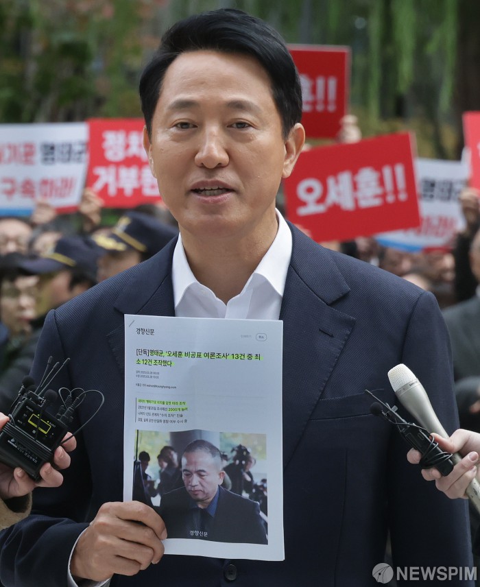 [서울=뉴스핌] 양윤모 기자 = 오세훈 서울시장이 8일 오전 정치자금법 위반 혐의 피의자 신분으로 서울 종로구 김건희 특검팀(특별검사 민중기)에 출석하고 있다. 특검팀은 오 시장과 참고인 신분의 명태균씨 간 여론조사비 대납 대질조사도 진행한다. 여론조사비 대납 의혹은 2021년 4·7 서울시장 보궐 선거 때 명태균씨가 실질적으로 운영한 여론조사업체 미래한국연구소가 13차례 비공표 여론조사를 실시하고, 오 시장의 오랜 후원자로 알려진 김한정씨로부터 비용 3300만 원을 대납 받았다는 내용이다. 2025.11.08 yym58@newspim.com