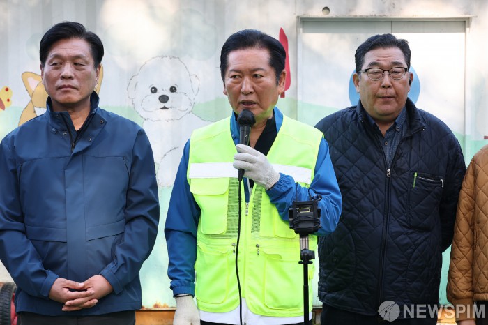 [경기=뉴스핌] 최지환 기자 = 정청래 더불어민주당 대표가 9일 오전 경기 용인시 동물보호단체 행강의 보호소를 찾아 자원봉사를 하기 전 인사말을 하고 있다. 2025.11.09 choipix16@newspim.com