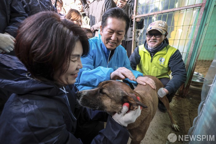 [용인=뉴스핌] 최지환 기자 = 정청래 더불어민주당 대표가 9일 오전 경기 용인시 동물보호단체 행강의 유기견 보호소를 찾아 강아지들과 인사하고 있다. 2025.11.09 choipix16@newspim.com
