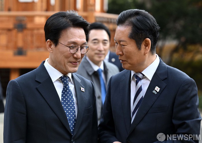 [서울=뉴스핌] 최지환 기자 = 김민석 국무총리, 정청래 더불어민주당 대표가 9일 오후 서울 종로구 국무총리공관에서 열린 고위당정협의회에 앞서 대화를 나누고 있다. 2025.11.09 choipix16@newspim.com