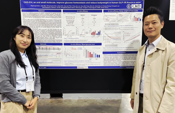 4일 미국 애틀란타에서 열린 '2025 미국비만학회(2025 Obesity Week)'에서는 경구용 GLP-1 수용체 작용제(GLP-1RA) 신약 후보물질 'CKD-514'의 비임상 연구 성과를 발표했다. CKD-514는 용해도 개선을 통한 구조적 이점을 바탕으로 대동물 모델에서 우수한 경구 생체이용률(Dog BA)을 보였으며, 경구용 비만치료제 오포글리프론(Orforglipron) 대비 적은 용량에서 유의한 체중 감소 효과와 동일 용량 대비 우수한 혈당 강하 효과를 나타냈다. CKD-514의 후속 화합물군 역시 오포글리프론과 세마글루타이드(Semaglutide)와의 비교 시험에서 두 약물과 동등하거나 우월한 대사 개선 효과가 있음을 확인했다. 복용 편의성이 높은 경구 제형 비만치료제 개발에 성공한다면, 주사형 비만 치료제가 주류를 이루는 글로벌 시장에서 차별성과 경쟁력을 확보할 것으로 기대된다.