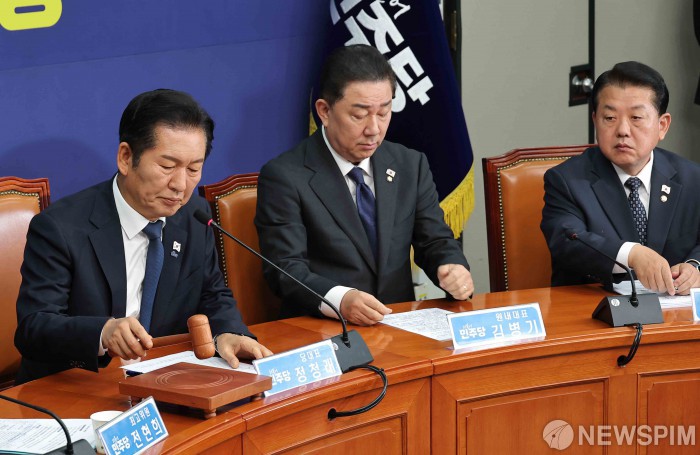 [서울=뉴스핌] 윤창빈 기자 = 정청래 더불어민주당 대표가 10일 오전 서울 여의도 국회에서 열린 최고위원회의에서 의사봉을 두드리고 있다. 2025.11.10 pangbin@newspim.com