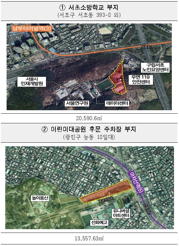 [서울=뉴스핌] 이동훈 선임기자 = 경부고속도로 서초나들목(IC)부근 서초소방학교 및 우면119안전센터부지에 400가구 이상 시니어주택 단지가 들어선다. 또 광진구 어린이대공원 후문주차장에 주차장과 어린이 육아시설이 조성된다.