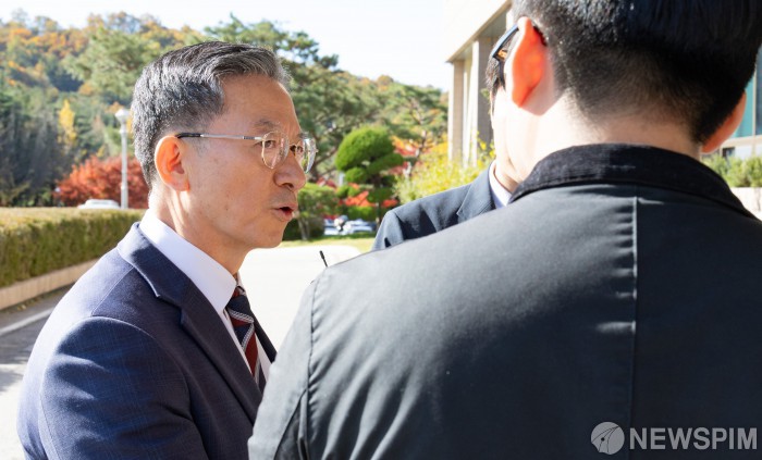 [과천=뉴스핌] 최지환 기자 = 정성호 법무부 장관이 10일 오전 경기 과천시 법무부 청사로 출근하며 검찰의 대장동 '항소 포기'와 관련해 취재진 질문에 답변하고 있다. 2025.11.10 choipix16@newspim.com