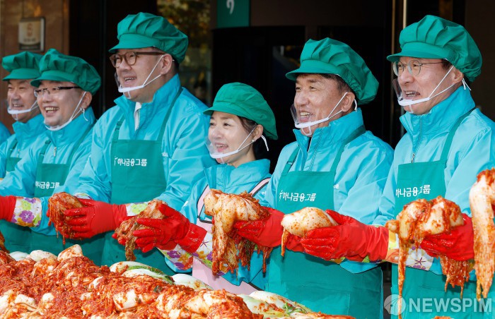 [서울=뉴스핌] 류기찬 기자 = 함영주 하나금융지주 회장(오른쪽에서 두번째)을 비롯한 임직원들이 10일 오전 서울 중구 하나금융그룹 명동사옥에서 열린 ‘2025년 모두하나데이 사랑의 김장나눔’ 행사에서 김장을 하고 있다. 2025.11.10 ryuchan0925@newspim.com