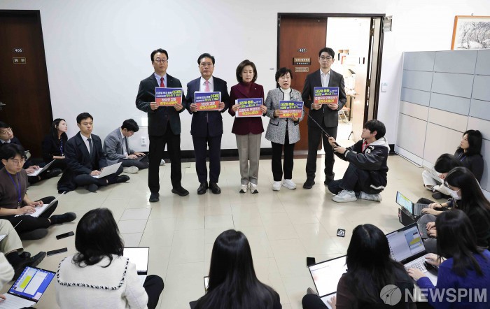 [서울=뉴스핌] 윤창빈 기자 = 나경원 국민의힘 의원을 비롯한 국회 법제사법위원회 소속 의원들이 10일 서울 여의도 국회에서 열린 이재명 측근 대장동 비리 사건 항소 포기 관련 추미애 위원장 법사위 개의요구 거부에 대한 규탄 및 기자회견에서 피켓을 들고 있다. pangbin@newspim.com