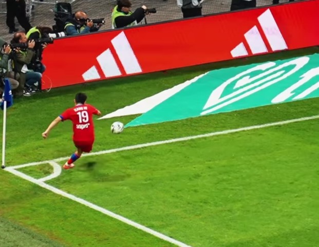 | 이강인이 10일 리옹과의 경기 후반 추가시간 왼발로 코너킥을 차고 있다. 이 킥은 주앙 네베스의 헤더 결승골로 이어졌다. [사진=PSG] |