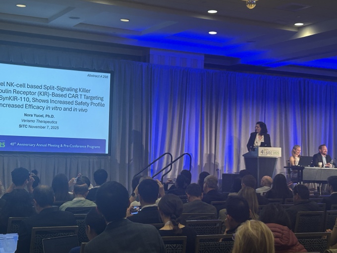 | 베리스모 테라퓨틱스의 수석 과학자 노라 유셀(Nora Yucel) 박사가 지난 7~9일 미국 메릴랜드에서 개최된 'SITC 2025' 구두발표 세션에서 'SynKIR-110'의 전임상 데이터에 대해 발표하고 있다. [사진=HLB이노베이션] |