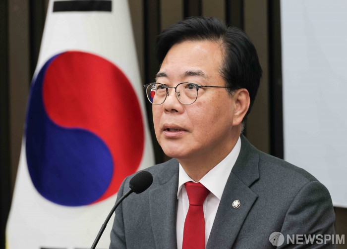 [서울=뉴스핌] 윤창빈 기자 = 송언석 국민의힘 원내대표가 10일 서울 여의도 국회에서 열린 의원총회에서 모두발언을 하고 있다. pangbin@newspim.com