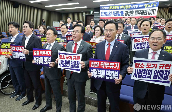 [서울=뉴스핌] 윤창빈 기자 = 송언석 국민의힘 원내대표를 비롯한 소속 의원들이 10일 서울 여의도 국회에서 열린 의원총회에서 대장동 사건 항소 포기를 규탄하는 피켓팅을 하고 있다. pangbin@newspim.com