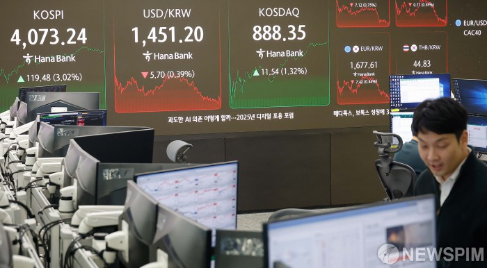 [서울=뉴스핌] 류기찬 기자 = 10일 오후 서울 중구 하나은행 딜링룸 전광판에 코스피, 달러/원, 코스닥 지수가 표시되고 있다. 이날 코스피 지수는 전 거래일 대비 119.48포인트(3.02%) 오른 4073.24에, 달러/원 환율은 5.50원 내린 1451.40원에, 코스닥 지수는 11.54포인트(1.32%) 오른 888.35에 장을 마감했다. 2025.11.10 ryuchan0925@newspim.com