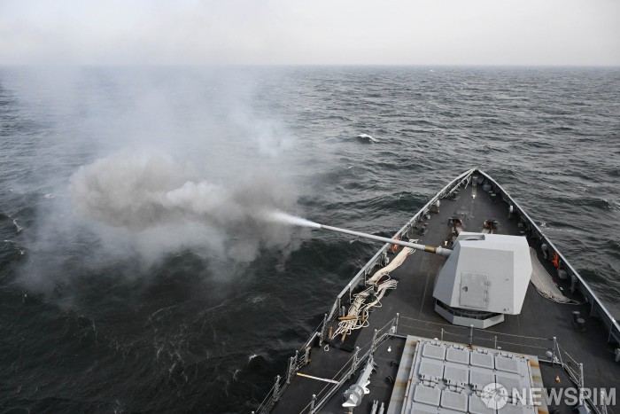| [평택=뉴스핌] 사진공동취재단 = 지난 3월 25일 서해 중부 해상에서 실시된 해상기동훈련에서 대전함(FFG-II, 3100톤)이 실사격 훈련을 하고 있다. 해군은 제10회 서해수호의 날을 맞아 3월 25일부터 27일까지 동·서·남해 전 해역에서 훈련을 진행한다. 이번 훈련에는 1·2·3함대 및 기동함대 예하 수상함 30여 척, 잠수함, 해군 P-3 해상초계기 및 공군 KF-16 전투기 등이 참가해 대함·대잠·대공 함포 실사격 등 적 도발유형별 훈련을 실전적으로 실시한다. 2025.03.26 photo@newspim.com |
