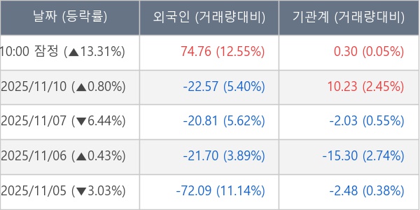 [서울=뉴스핌] 로보뉴스 = 11일 10시 15분 현재 에코프로(086520)는 외국인과 기관이 각각 74.76 만 주, 0.30 만 주 순매수(잠정) 하면서 전일 대비 13.31% (현재가 99,600원) 상승하고 있다.