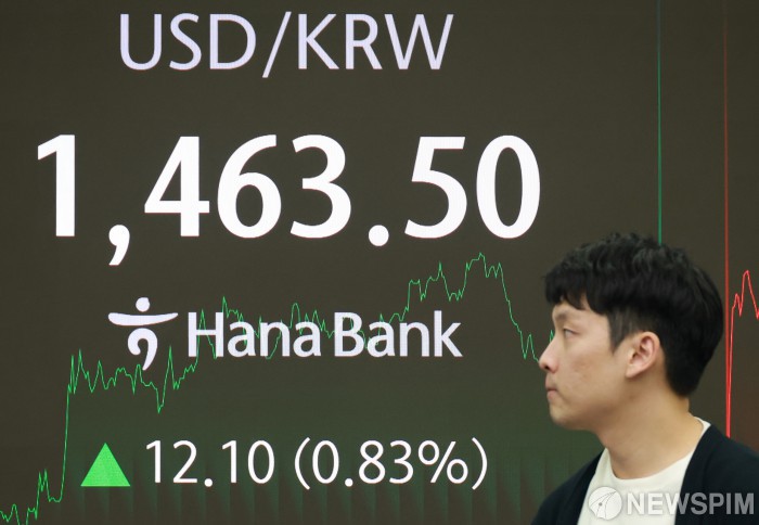 [서울=뉴스핌] 김학선 기자 = 달러/원 환율이 1460원대를 돌파한 11일 오후 서울 중구 하나은행 딜링룸 전광판에 달러/원 환율이 표시돼 있다. 2025.11.11 yooksa@newspim.com