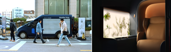 | 12일 업계에 따르면 현대건설은 최근 '헤이슬립'을 '힐스테이트 레이크 송도 4차' 게스트하우스에 최초 적용하며, 입주민과 방문객이 직접 체험할 수 있는 상용화 모델을 공개했다. 사진은 현대차 '모바일냅' 외장(좌), 현대차 '모바일냅' 내부 사진 (우) [사진=현대건설] |