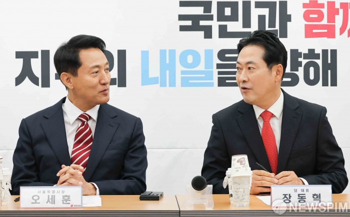 [서울=뉴스핌] 윤창빈 기자 = 장동혁 국민의힘 대표, 오세훈 서울시장이 12일 서울 여의도 국민의힘 중앙당사에서 열린 지방선거총괄기획단 및 시·도 광역단체장 연석회의에서 대화를 나누고 있다. 2025.11.12 pangbin@newspim.com