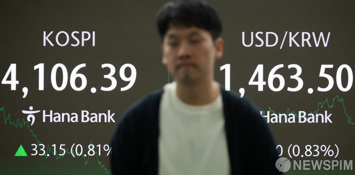 | [서울=뉴스핌] 김학선 기자 = 11일 코스피 지수는 전 거래일 대비 33.15p(0.81%) 오른 4106.39에 장을 마쳤다. 서울 외환시장에서 달러/원 환율은 오후 3시30분 기준 11.9원 오른 1463.3원에 마감했다. 이날 서울 중구 하나은행 딜링룸 전광판에 코스피 종가와 달러/원 환율이 표시돼 있다. 2025.11.11 yooksa@newspim.com |