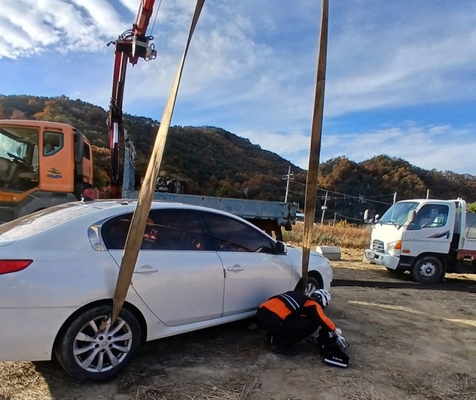 | 11일 오후 3시24분쯤 안동시 남후면 광음리의 한 공터에서 크레인으로 승용차를 들어 올려 하부 확인작업을 하던 중 매달려 있던 승용차가 떨어져 60대 남성이 숨지는 사고가 났다.[사진=경북소방본부]2025.11.12 nulcheon@newspim.com |
