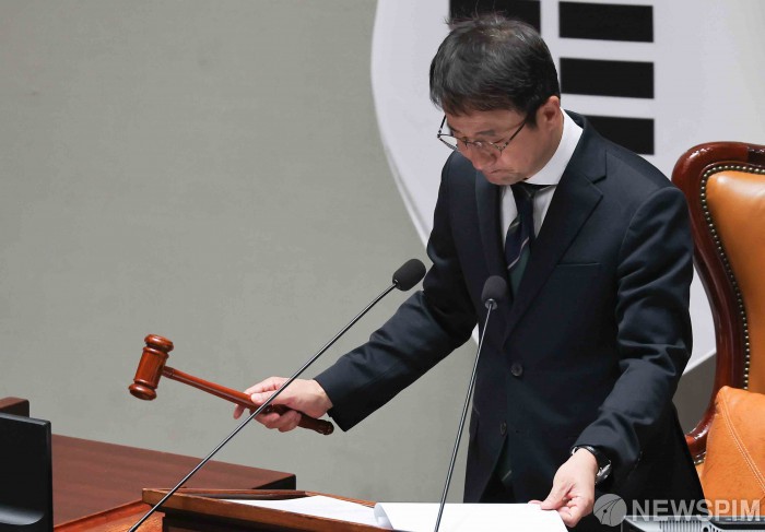 [서울=뉴스핌] 윤창빈 기자 = 한병도 위원장이 12일 서울 여의도 국회에서 열린 예산결산특별위원회 전체회의에서 의사봉을 두드리고 있다. 2025.11.12 pangbin@newspim.com