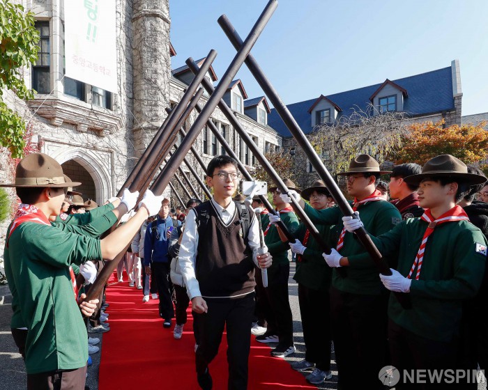 [서울=뉴스핌] 류기찬 기자 = 2026학년도 대학수학능력시험을 하루 앞둔 12일 오전 서울 종로구 중앙고등학교에서 열린 장행식에서 고3 수험생들이 후배들과 선생님들의 응원을 받으며 교정을 나서고 있다. 2025.11.12 ryuchan0925@newspim.com