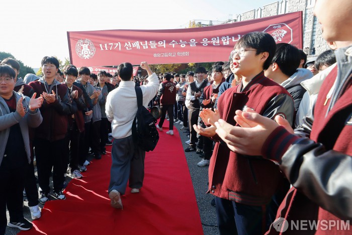 [서울=뉴스핌] 류기찬 기자 = 2026학년도 대학수학능력시험을 하루 앞둔 12일 오전 서울 종로구 중앙고등학교에서 열린 장행식에서 고3 수험생들이 후배들과 선생님들의 응원을 받으며 교정을 나서고 있다. 2025.11.12 ryuchan0925@newspim.com