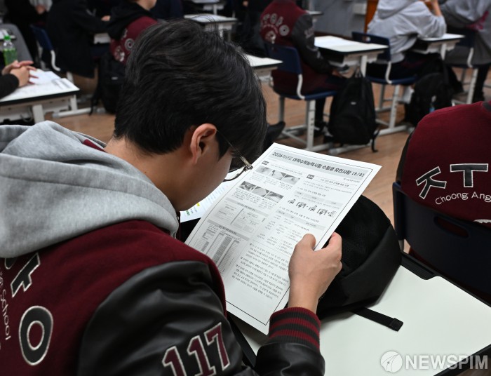 | [서울=뉴스핌] 류기찬 기자 = 2026학년도 대학수학능력시험을 하루 앞둔 12일 오전 서울 종로구 중앙고등학교에서 고3 수험생이 수능 유의사항이 담긴 자료를 살펴보고 있다. 2025.11.12 ryuchan0925@newspim.com |