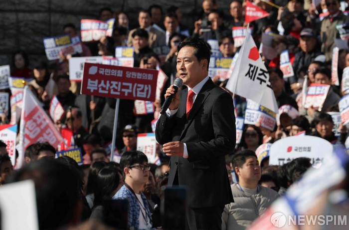 [서울=뉴스핌] 윤창빈 기자 = 장동혁 국민의힘 대표가 12일 서울 여의도 국회 본관 계단에서 열린 대장동 일당 7400억 국고 환수 촉구 및 검찰 항소포기 외압 규탄대회에서 규탄사를 하고 있다. 2025.11.12 pangbin@newspim.com