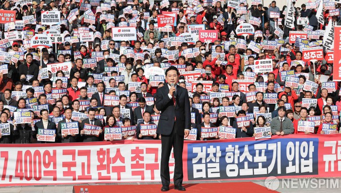 [서울=뉴스핌] 윤창빈 기자 = 장동혁 국민의힘 대표가 12일 서울 여의도 국회 본관 계단에서 열린 대장동 일당 7400억 국고 환수 촉구 및 검찰 항소포기 외압 규탄대회에서 규탄사를 하고 있다. 2025.11.12 pangbin@newspim.com