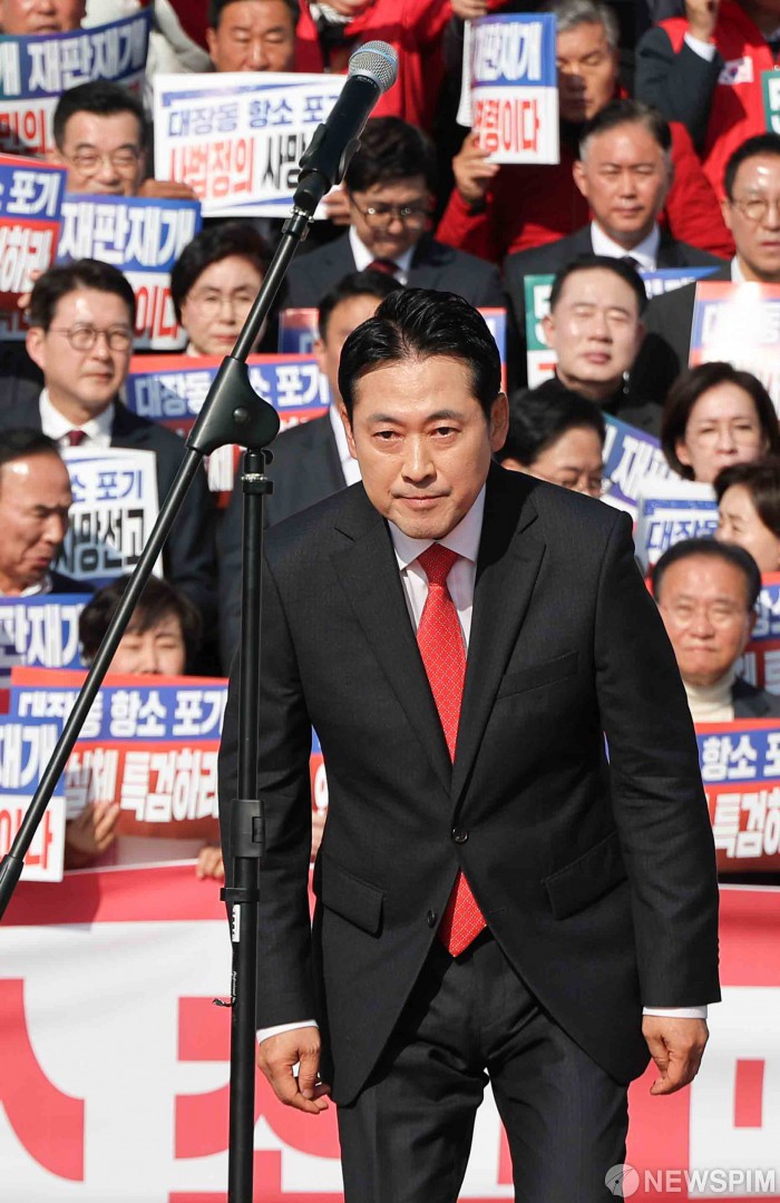 [서울=뉴스핌] 윤창빈 기자 = 장동혁 국민의힘 대표가 12일 서울 여의도 국회 본관 계단에서 열린 대장동 일당 7400억 국고 환수 촉구 및 검찰 항소포기 외압 규탄대회에서 규탄사를 하기 위해 단상에 오르고 있다. 2025.11.12 pangbin@newspim.com