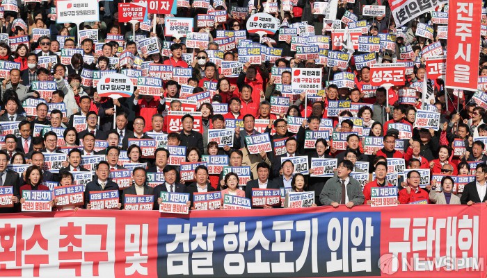 [서울=뉴스핌] 윤창빈 기자 = 장동혁 국민의힘 대표, 송언석 원내대표를 비롯한 소속 의원들 및 참석자들이 12일 서울 여의도 국회 본관 계단에서 열린 대장동 일당 7400억 국고 환수 촉구 및 검찰 항소포기 외압 규탄대회에서 구호를 외치고 있다. 2025.11.12 pangbin@newspim.com
