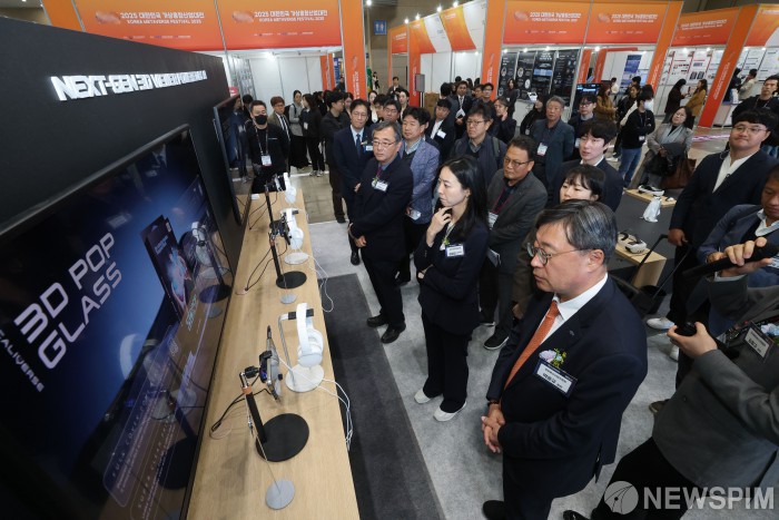 [고양=뉴스핌] 김학선 기자 = 박윤규 정보통신산업진흥원 원장, 설재진 과학기술정보통신부 디지털콘텐츠과장, 유지상 메타버스 얼라이언스 의장이 12일 경기 고양시 킨텍스에서 열린 2025 대한민국 가상융합산업대전(KMF2025)에서 전시 참여기업부스를 둘러보고 있다. 'AI와 만난 가상융합, 모두의 일상이 되다!'를 주제로 열린 'KMF2025'는 오는 14일까지 3일간 진행된다. 2025.11.12 yooksa@newspim.com