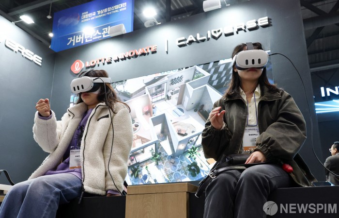 [고양=뉴스핌] 최지환 기자 = 12일 고양 킨텍스에서 열린 2025 대한민국 가상융합산업대전(KMF2025)에서 관람객들이 칼리버스 부스에서 VR 컨텐츠를 체험하고 있다. 'AI와 만난 가상융합, 모두의 일상이 되다!'를 주제로 열린 'KMF2025'는 오는 14일까지 3일간 진행된다. 2025.11.12 choipix16@newspim.com