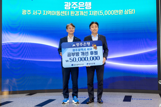 [광주=뉴스핌] 김시아 기자 = 광주은행은 서구청에서 '희망이 꽃피는 공부방' 후원금 5000만 원을 전달했다고 12일 밝혔다. 전달식에는 이상채 광주은행 부행장과 김이강 서구청장 등 관계자들이 참석했다.