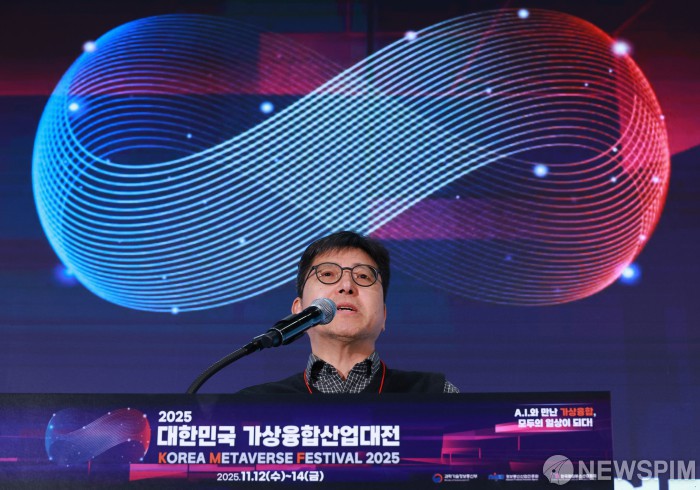 [고양=뉴스핌] 김학선 기자 = 우운택 한국과학기술원 교수가 12일 경기 고양시 킨텍스에서 열린 2025 대한민국 가상융합산업대전(KMF2025) 글로벌 컨퍼런스에서 '가상현실에서 증강사회로!'를 주제로 웰컴스피치를 하고 있다. 'AI와 만난 가상융합, 모두의 일상이 되다!'를 주제로 열린 'KMF2025'는 오는 14일까지 3일간 진행된다. 2025.11.12 yooksa@newspim.com
