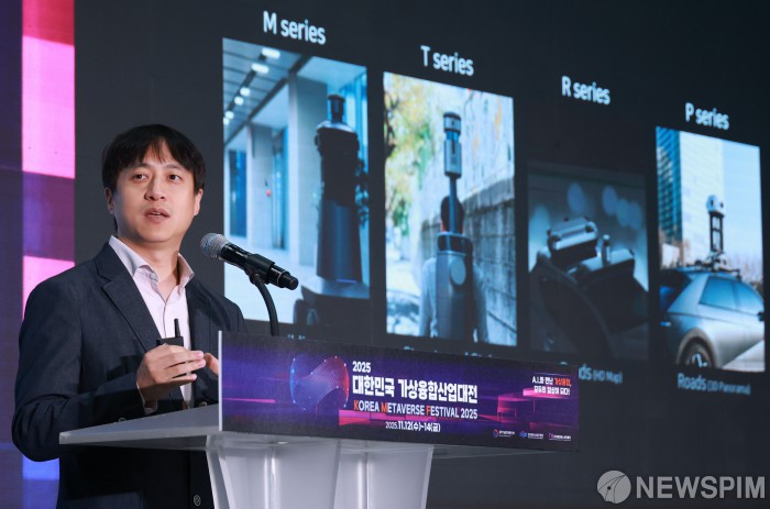 [고양=뉴스핌] 김학선 기자 = 이동환 네이버랩스 비전그룹 부문장이 12일 경기 고양시 킨텍스에서 열린 2025 대한민국 가상융합산업대전(KMF2025) 글로벌 컨퍼런스에서 '사람, 정보, 공간의 새로운 연결'을 주제로 기조강연을 하고 있다. 'AI와 만난 가상융합, 모두의 일상이 되다!'를 주제로 열린 'KMF2025'는 오는 14일까지 3일간 진행된다. 2025.11.12 yooksa@newspim.com