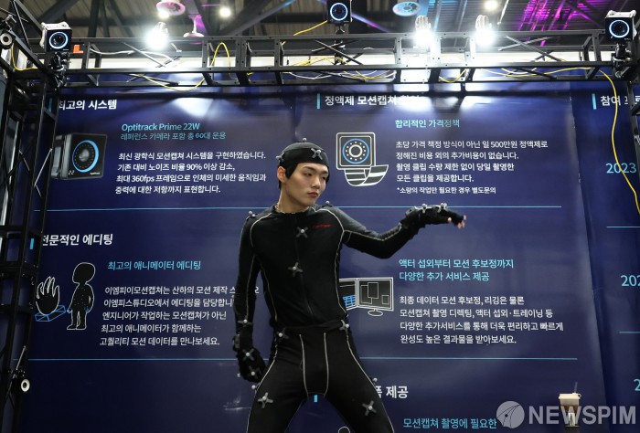 [고양=뉴스핌] 최지환 기자 = 12일 고양 킨텍스에서 열린 2025 대한민국 가상융합산업대전(KMF2025)에서 이엠피 관계자가 모션 캡쳐 기술을 선보이고 있다. 'AI와 만난 가상융합, 모두의 일상이 되다!'를 주제로 열린 'KMF2025'는 오는 14일까지 3일간 진행된다. 2025.11.12 choipix16@newspim.com