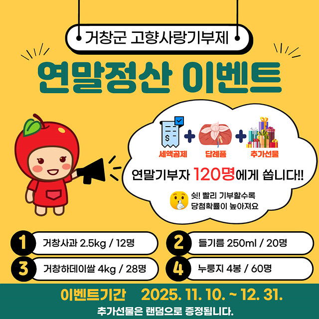 지난 10일부터 12월 31일까지 진행되는 이번 이벤트는 10만원 이상 기부자 중 총 120명을 무작위 추첨해 거창사과, 들기름, 거창하데이쌀, 누룽지 등을 나눠준다.