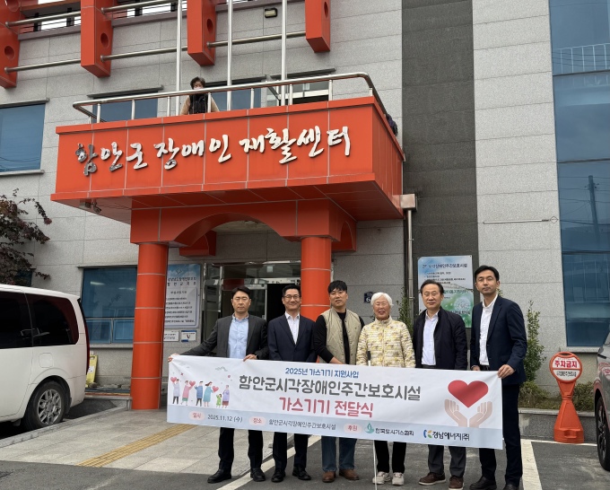 경남에너지와 한국도시가스협회가 지난 11일 경남 함안군 소재 시각장애인주간보호센터에서 지역 복지시설을 위한 '가스기기 지원사업' 기증식을 갖고 기념사진을 찍고 있다. [사진=경남에너지] 2025.11.12
