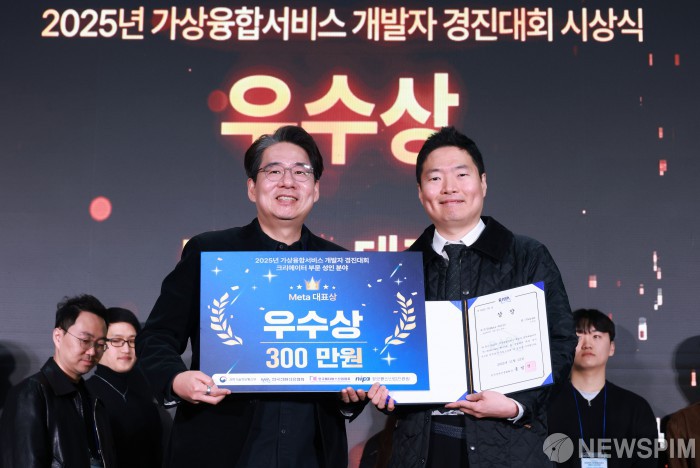 [고양=뉴스핌] 김학선 기자 = 12일 경기 고양시 킨텍스에서 열린 2025 대한민국 가상융합산업대전(KMF2025)에서 '2025년 가상융합서비스 개발자 경진대회' 크리에이터 부문 성인 분야 우수상을 수상한 'K-Verse' 팀이 기념촬영을 하고 있다. 'AI와 만난 가상융합, 모두의 일상이 되다!'를 주제로 열린 'KMF2025'는 오는 14일까지 3일간 진행된다. 2025.11.12 yooksa@newspim.com