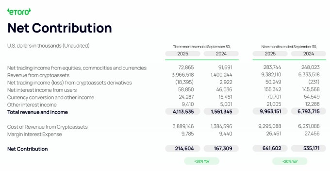 | 이토로의 2025년 3분기 매출과 순기여도 [자료 = 업체 홈페이지] |