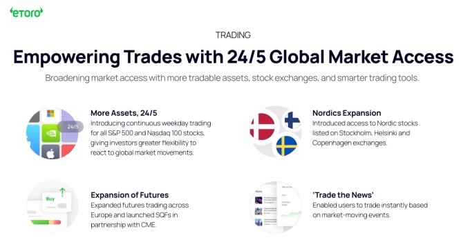 이토로는 트레이딩, 투자, 자산 관리, 네오 뱅킹이라는 4가지 전략적 축을 통해 제품 제공을 지속적으로 확장하고 있다. 최근에는 S&P 500 및 나스닥 100 주식에 대한 주중 지속 거래, 유럽에서의 선물 제공 확대, 새로운 AI 기반 투자 도구 등을 출시하며 혁신을 거듭하고 있다.