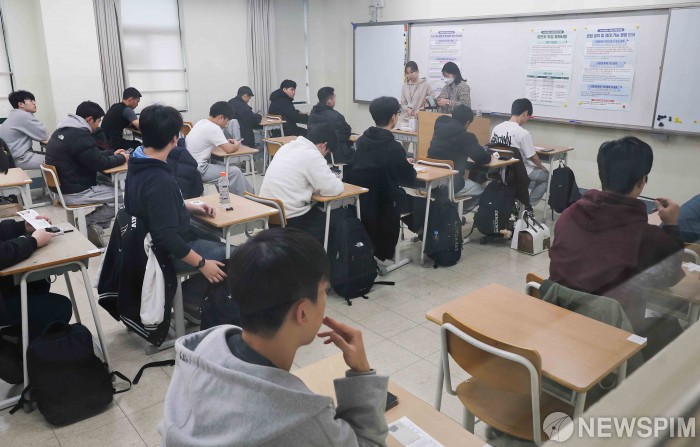 [서울=뉴스핌] 윤창빈 기자 = 2026학년도 대학수학능력시험이 실시된 13일 오전 서울 용산구 용산고등학교에서 수험생들이 시험 준비를 하고 있다. 2025.11.13 pangbin@newspim.com