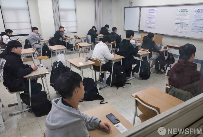 [서울=뉴스핌] 윤창빈 기자 = 2026학년도 대학수학능력시험이 실시된 13일 오전 서울 용산구 용산고등학교에서 수험생들이 시험 준비를 하고 있다. 2025.11.13 pangbin@newspim.com