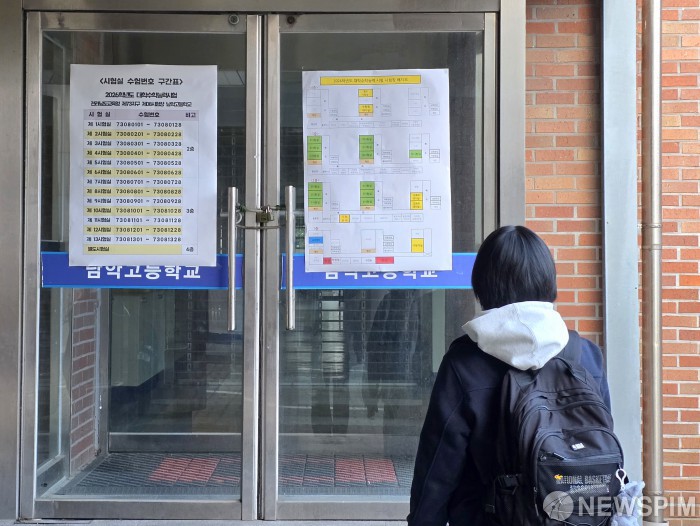 [무안=뉴스핌] 조은정 기자 = 2026학년도 대학수학능력시험이 시행된 13일 오전 전남 무안군 남악고등학교에 마련된 전남도교육청 제73지구 제8시험장에서 수험생들이 시험장 위치를 확인하고 있다. 2025.11.13 ej7648@newspim.com