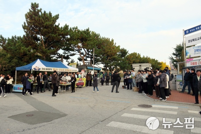 [울진=뉴스핌] 남효선 기자 =  대학수학능력시험(대입 수능)일인 13일, 경북 동해안권의 아침 기온이 5~8도의 분포를 보이며 비교적 포근한 가운데 울진 지역 수능 고사장인 울진고등학교 정문에서 울진고 등 지역 내 고교 교사들이 손팻말을 들고 수험생들을 응원하고 있다. 수능 고사장 입구에는 울진중고등학교 총동창회가 부스를 설치하고 따뜻한 음료와 좋은 성적을 기원하는 '찰떡' 등을 준비해 수험생들을 맞았다. 또 손병복 울진군수를 비롯한 지역 사회 교육 관련 단체장, 군의원 등이 교문 앞에서 따뜻하게 수험생들을 맞으며 격려했다. 수험생들은 환한 얼굴로 이날 오전 8시 10분까지 수능 고사실로 모두 입실했다. 이번 울진 지역 내 수능 응시생은 모두 355명이며 학교별로는 울진고 170명, 죽변고 93명, 후포고 62명, 경북관광비즈니스고 14명, 주민등록상 주소지 학생 16명 등이다.2025.11.13 nulcheon@newspim.com