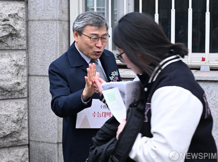 [서울=뉴스핌] 사진공동취재단 = 정근식 서울시교육감이 2026학년도 대학수학능력시험일인 13일 오전 서울 광진구 광남고등학교 교문 앞에서 수험생들을 응원하고 있다. 2025.11.13 photo@newspim.com
