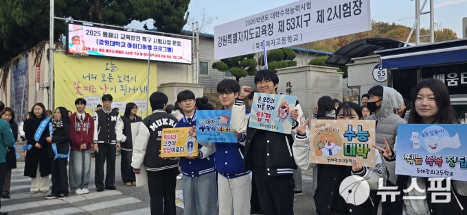 [동해=뉴스핌] 이형섭 기자 = 2026학년도 대학수학능력시험이 치러지는 강원특별자치도교육청 제53지구 제2시험장인 북평여자고등학교 정문에서 동해 광희고 재학생들이 선배들의 수능 대박을 응원하고 있다.